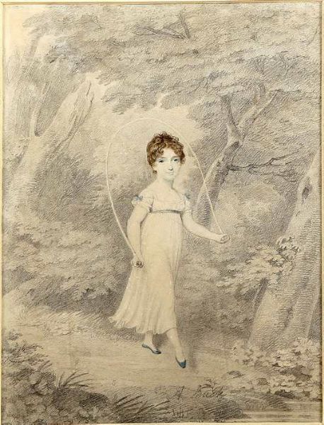 Young Girl with Skipping Rope wearing white dress with blue ribbon and blue shoes