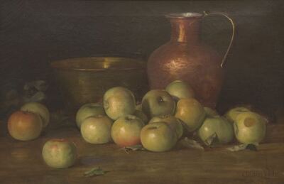 Still life with green apples and copper vessels