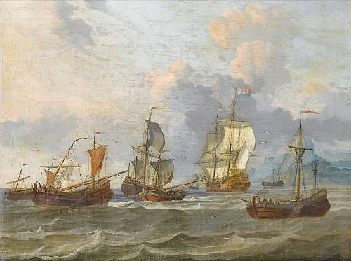 | Two Dutch men o'war, sloops and other vessels in choppy waters, off a mountainous coastline | |