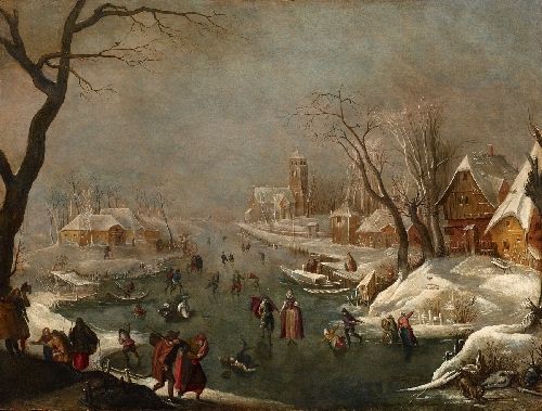 WINTERLANDSCHAFT MIT ZUGEFRORENEM KANAL UND SCHLITTSCHUHLÄUFERN