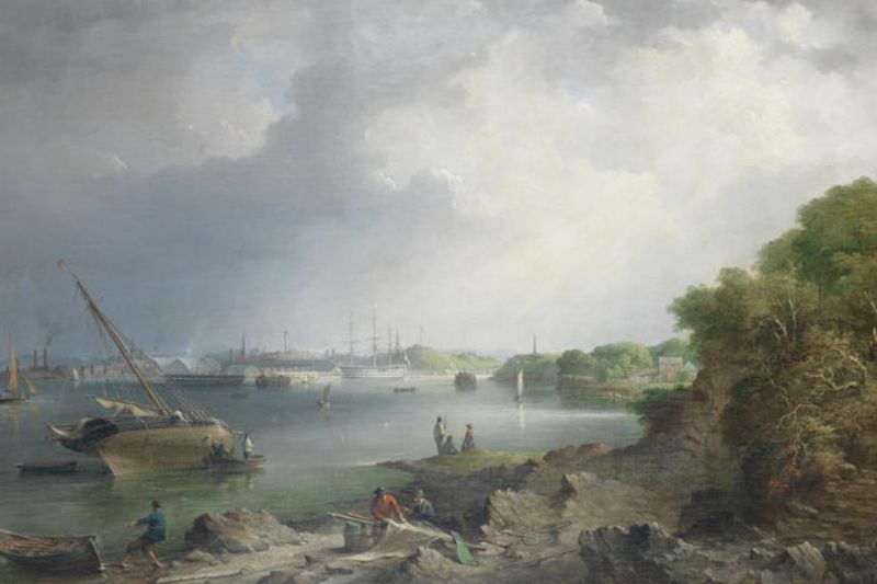| A view across the Hamoaze towards the covered slips and buildings of the naval dockyard at Devonport | |