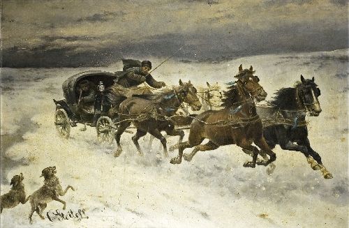 WINTERLANDSCHAFT MIT PFERDEGESPANN UND ANGREIFENDEN WÖLFEN