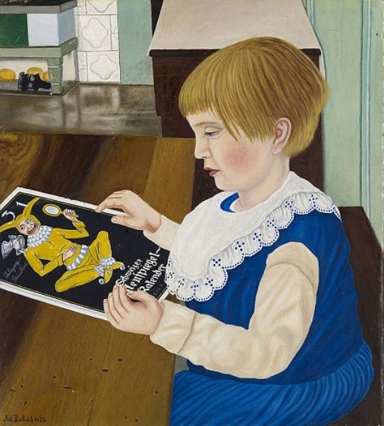 Mädchen mit Eulenspiegel-Kalender. 1932.
