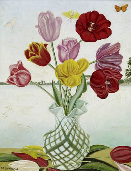 Tulpenstrauss vor Seelandschaft. 1948.