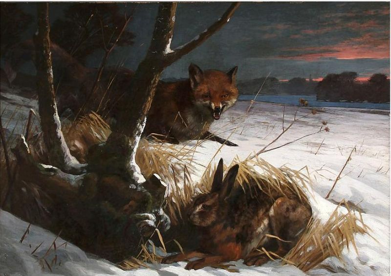 Winter landscape with a fox and a hare.