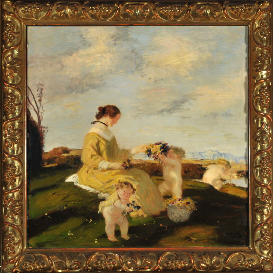 Auf Wiese sitzende Dame wird von Putten mit Blumen beschenkt