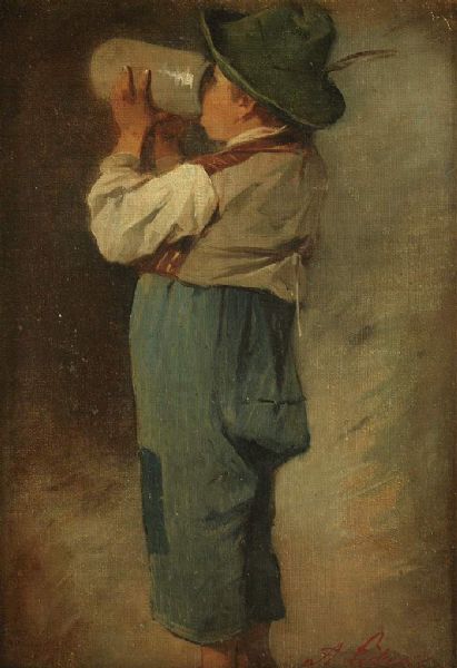 Kleiner Bauernbub mit Federhut aus Maßkrug trinkend.