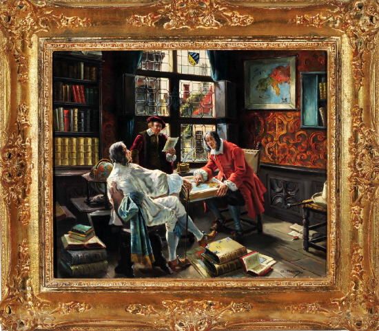 | Drei Herren diskutieren über einen Atlas gebeugt in einem herrschaftlichen Interieur | |