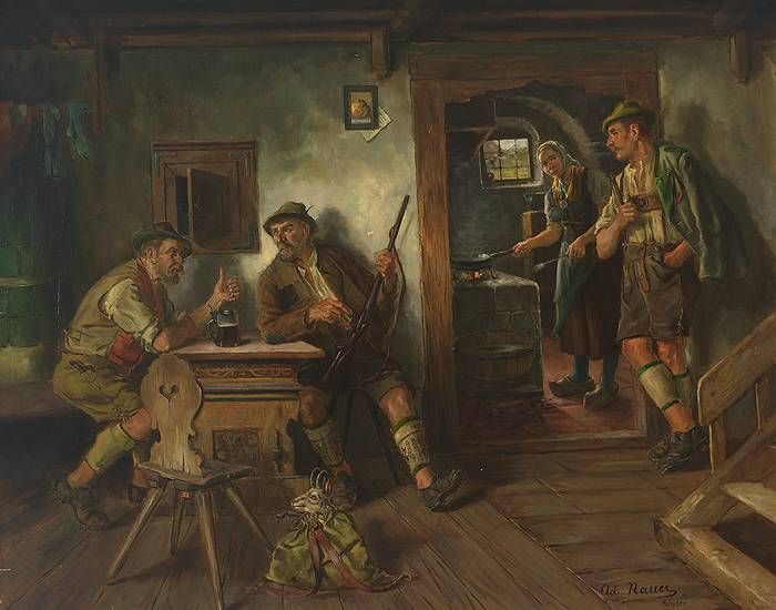 Ortsbez. München. Diskutierende Jäger in einem Bauernhaus