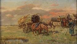 In weiter, grasbewachsener Ebene, Kosaken, die mit mehreren Pferdewagen Rast machen