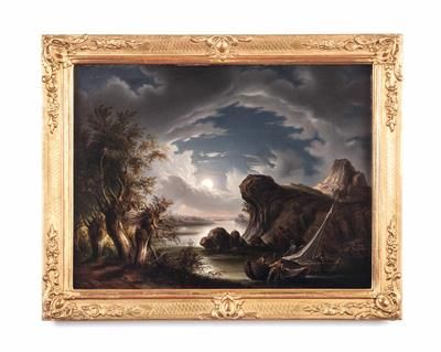Vollmondnacht über Flusslandschaft mit bemannten Booten