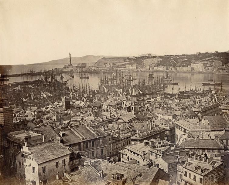 | Gênes, vue sur le port, "Terrasse en marbre blanc le long du quai" | |