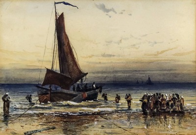 | Trawler anchored in shallow water with a group of people looking on | |