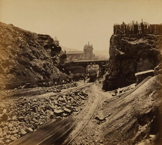 | Grands Travaux de Marseille, vue des chantiers prise du milieu de la Rue de Monbrion, juin 1863 | |