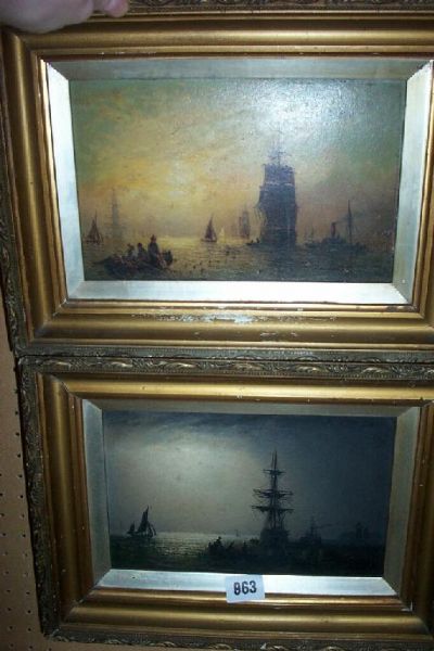 | one showing a marine scene at sunset and including a 3-masted sailing ship, a steam tugboat, fishermen pulling in nets etc | |