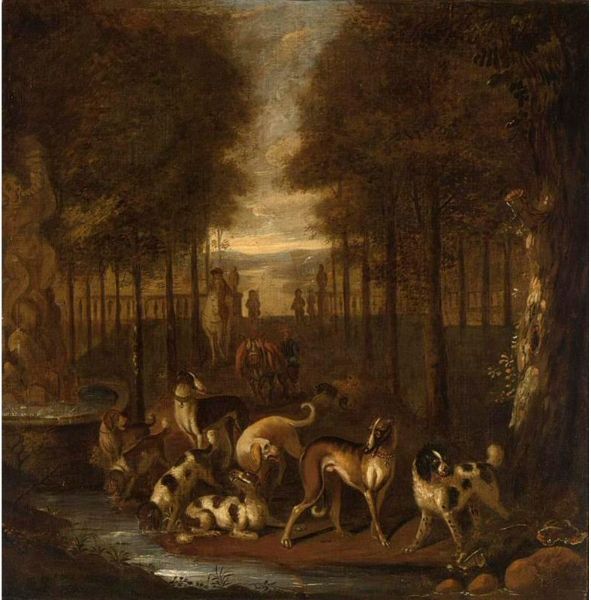 | SPANIELS AND OTHER HOUNDS IN A PARK SETTING NEXT TO A FOUNTAIN, A SPORTSMAN AND A TRAVELLER BEYOND, AN EXTENSIVE LANDSCAPE IN TH | |