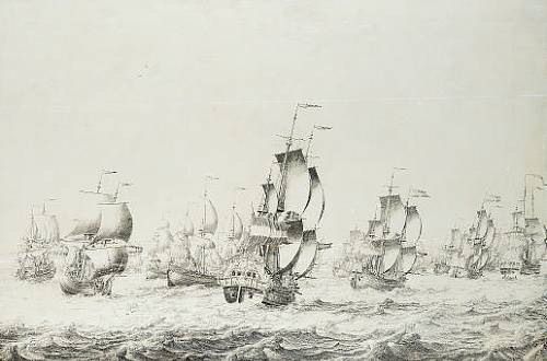 | A fleet of Dutch Bootschepen escorted by men-o’war, one being the frigate `T Wapen van Schiedam - a penschilderij | |