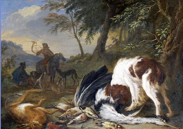 | A spaniel with a dead heron and other birds in a wooded landscape, huntsmen and their dogs beyond | |
