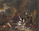 | STILL LIFE OF GAME WITH A HUNTSMAN SMOKING A PIPE TOGETHER WITH HIS HOUNDS IN A LANDSCAPE | |