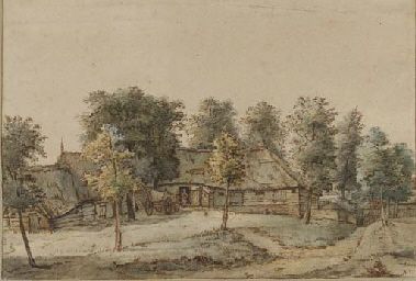 | A landscape with a farmhouse and a woman standing in the doorway | |