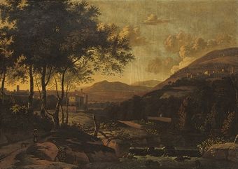 A wooded river landscape with a peasant woman and a dog on a track, a town beyond