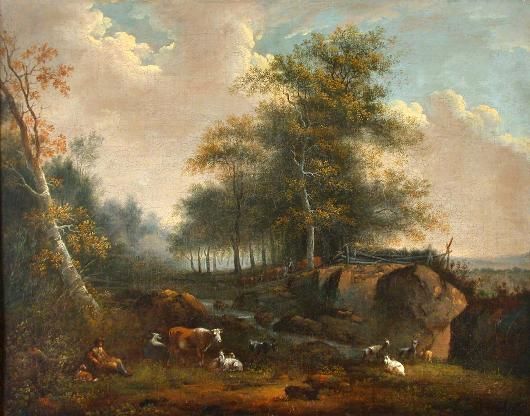 A Pastoral Landscape with a Shepherd his Dog Cattle and Goats