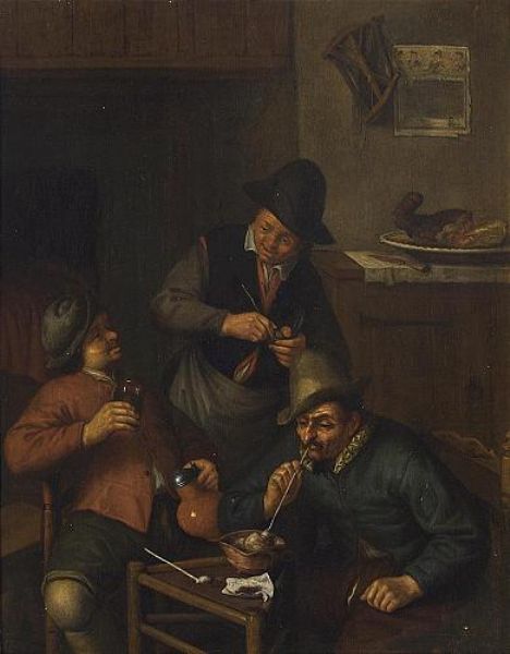 THREE MEN SMOKING A PIPE AND DRINKING IN AN INTERIOR