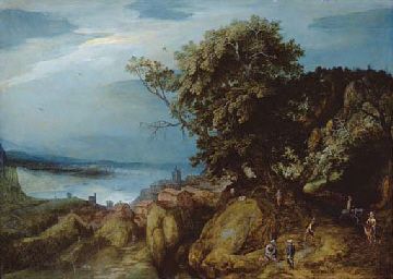 | A rocky river landscape with travellers on a path by a town | |