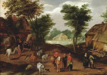 Travellers conversing in a village