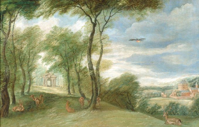 Herten in een bos bij een kasteel
