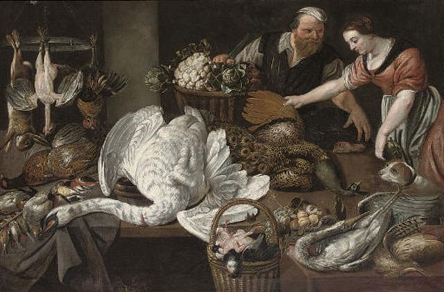 | A kitchen still life with a swan, a peacock, chicken, finches and other poultry laid on a table, with a maid, and a butcher | |