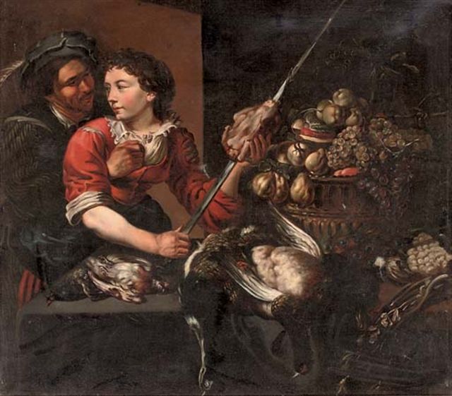 | A poulterer with a suitor, with grapes and pears in a bowl and dead game on a draped table | |