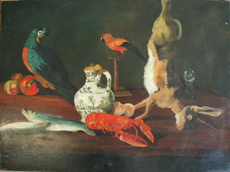 | STILL LIFE WITH DELFTWARE EWER, FISH, LOBSTER, PARROTS AND A HARE | |