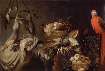 Ein Obst- und Gemüsestillleben mit einem Papagei und erlegtem Wild