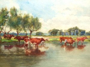 Cattle in a river and water meadow