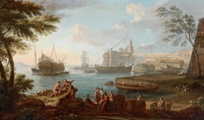Southern port with boats and numerous figures