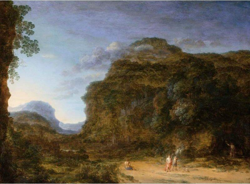 A ROCKY LANDSCAPE WITH FIGURES AND A DOG