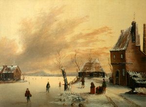 Figures on a frozen lake beside cottages
