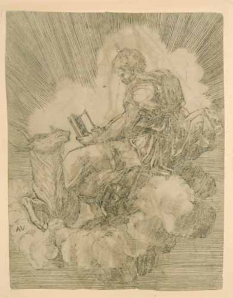 Der Evangelist Lukas auf einer Wolke sitzend, neben einem Stier
