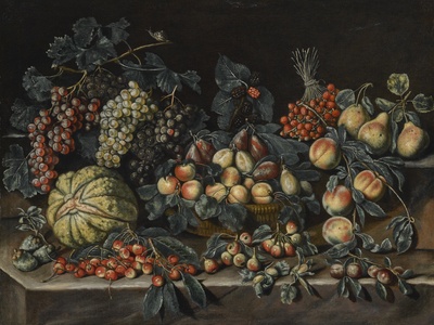 | STILL LIFE WITH GRAPES, MELON, PEACHES, APRICOTS, PRUNES, STRAWBERRY TREES AND BERRIES. | |