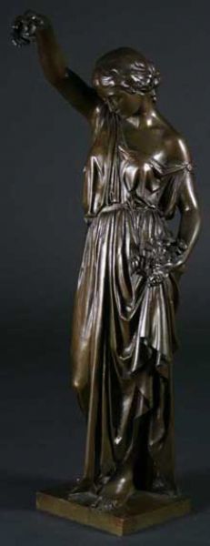 A Classical Bronze Statuette of a young woman holding flowers and wearing a long flowing robe