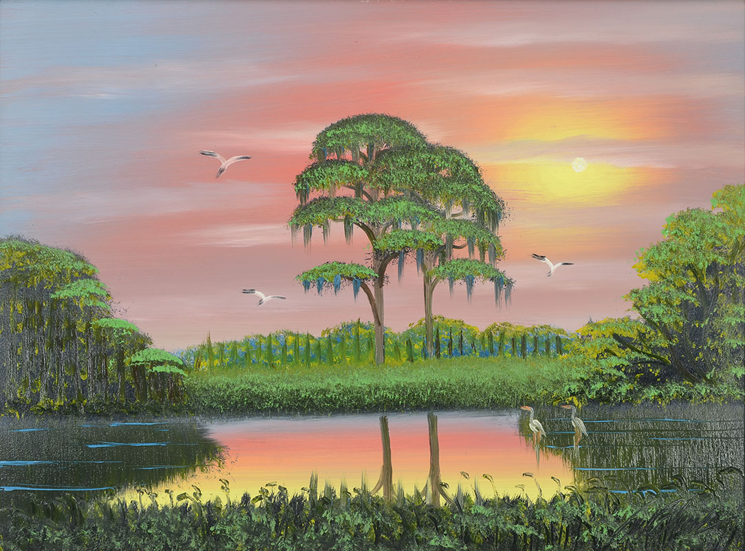 | Florida Highwaymen backwaters scene with cypress tree stand and birds, vibrant sunrise pastel colors | |