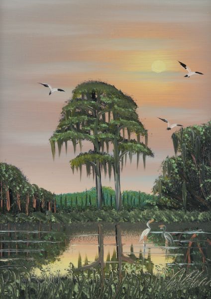 Florida Highwaymen backwaters scene with stand of trees and birds