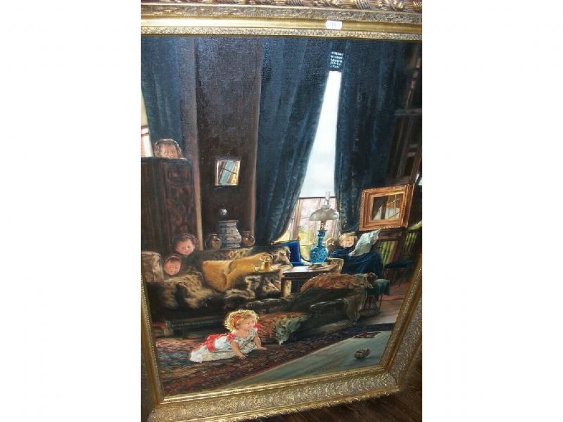 | Victorian style showing an interior scene with children playing hide and seek while their mother reads | |