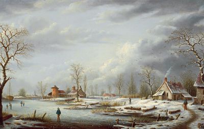 Winter landscape with travellers