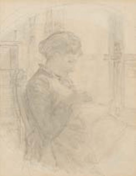 STRICKENDE FRAU VOR EINEM FENSTER.