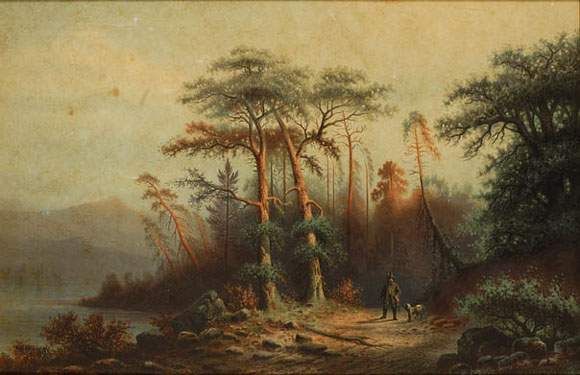 Chasseur et son chien dans un paysage
