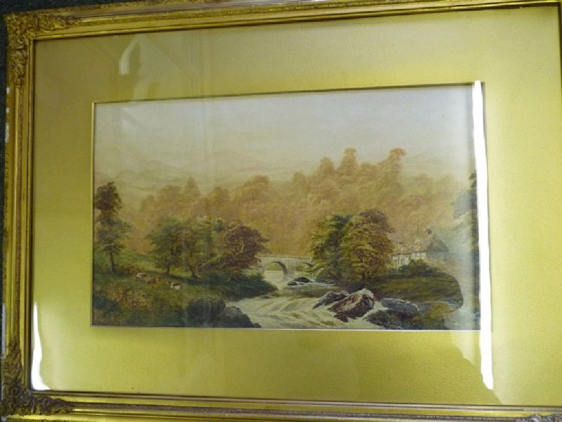 | Extensive river landscape with thatched house, stone bridge and cows | |