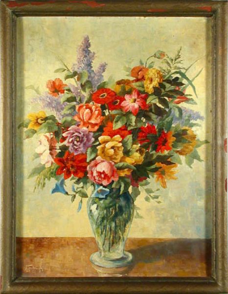 Bunter Gartenblumenstrauß in einer Glasvase vor changierendemm Hintergrund
