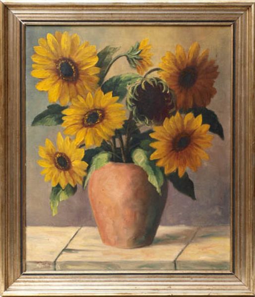 Sonnenblumenstrauß in Tonvase vor changierendem Hintergrund